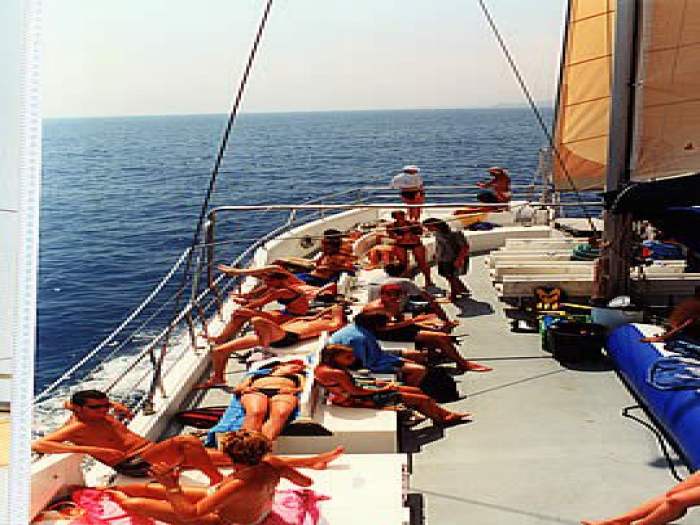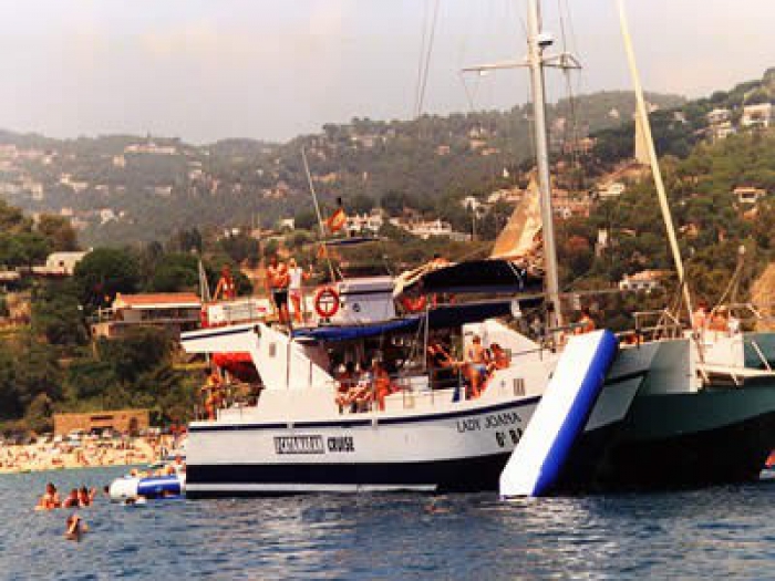 The Catamaran Cruise is an excursion aboard the sailing catamaran Lady Joana, including a stop at a beautiful secluded cove for water activities. The experience is fully all-inclusive, with no extra costs.